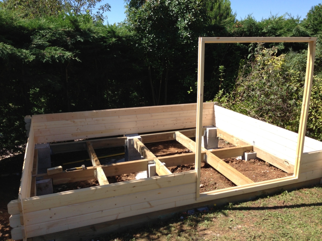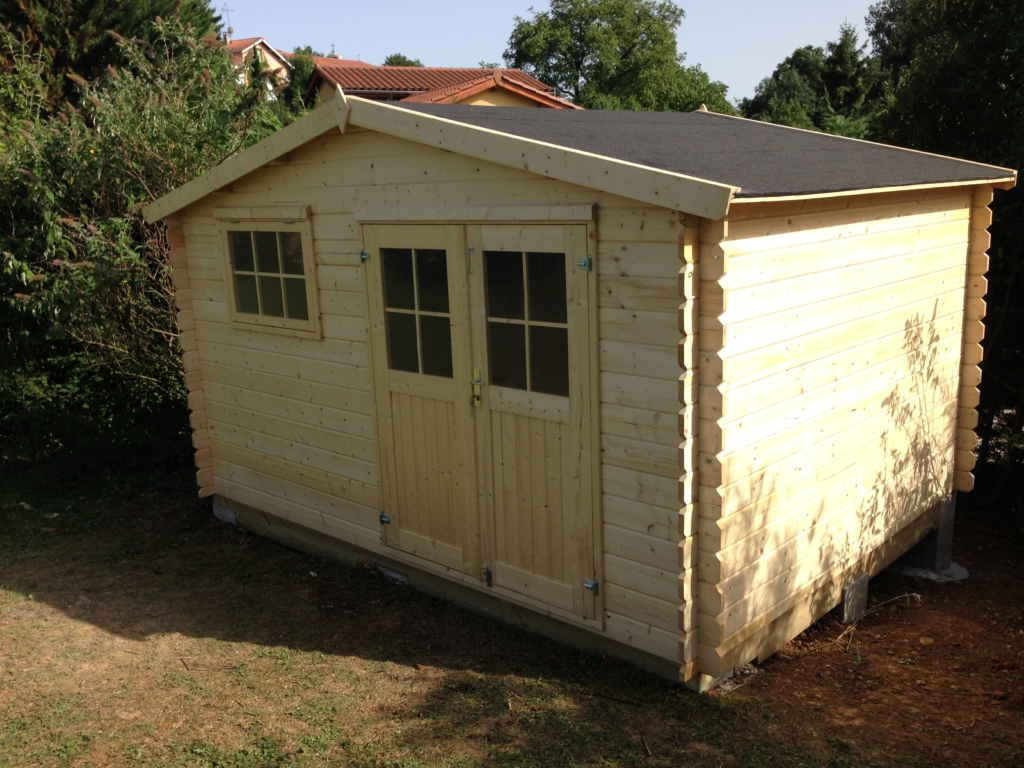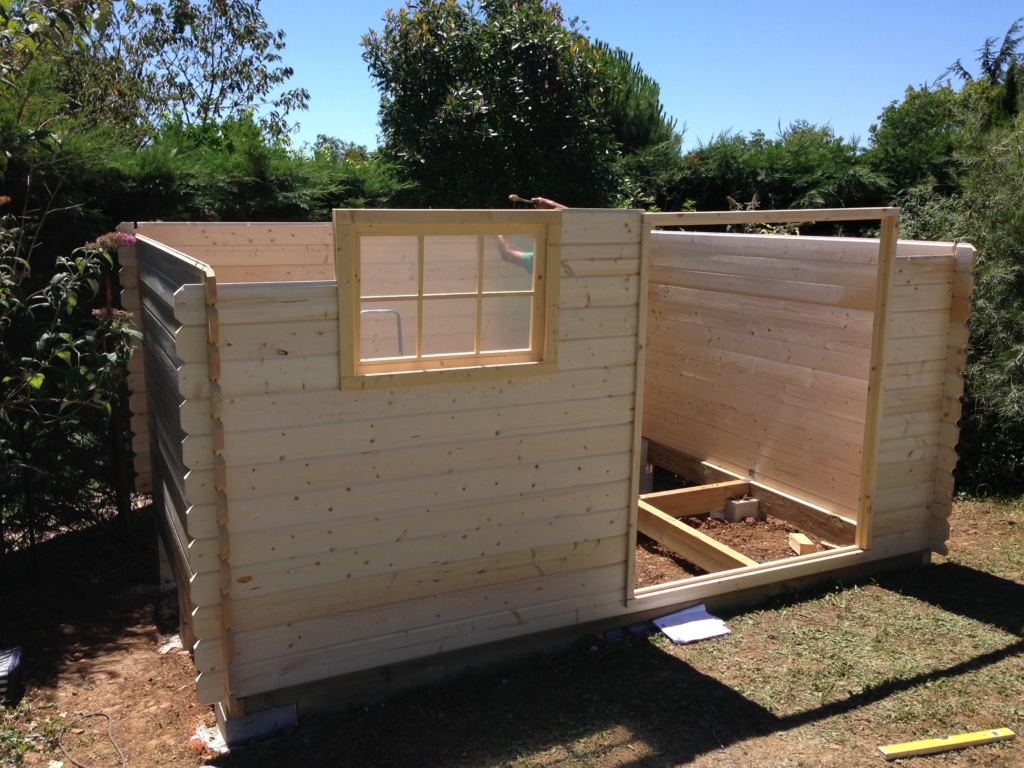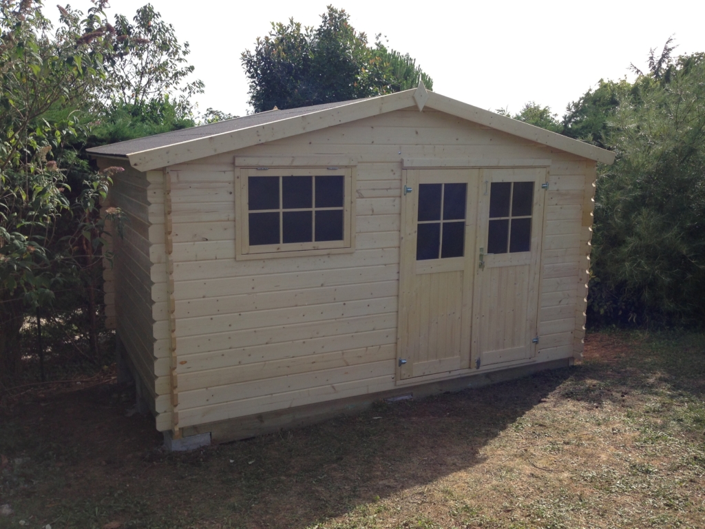 Montage d’un abri de jardin en Sapin Epicéa (provenance Europe du nord), à madriers de 28mm. Il est équipé d’un plancher, d’une porte double vitrée et d’une fenêtre basculante. Pour une stabilité parfaite, la structure de cet abri a été posée et fixée solidement sur des piliers en béton, montés à des hauteurs différentes (terrain pentu). Le toit est habillé d’une couverture en feutre bitumé noir.