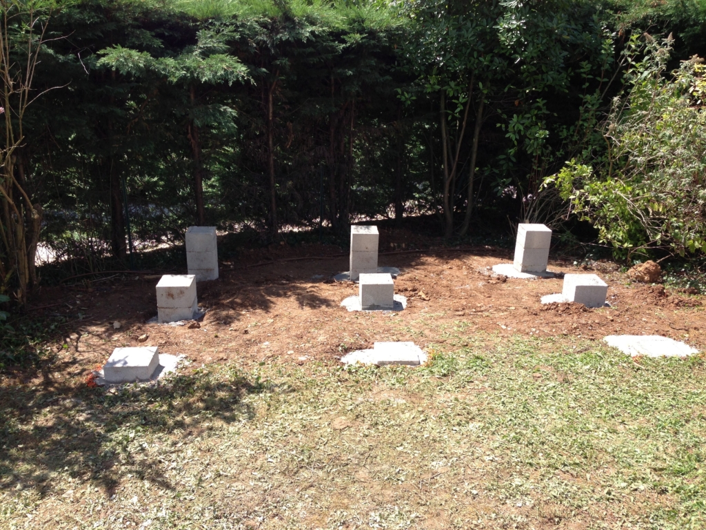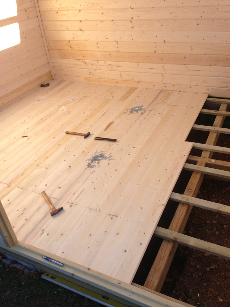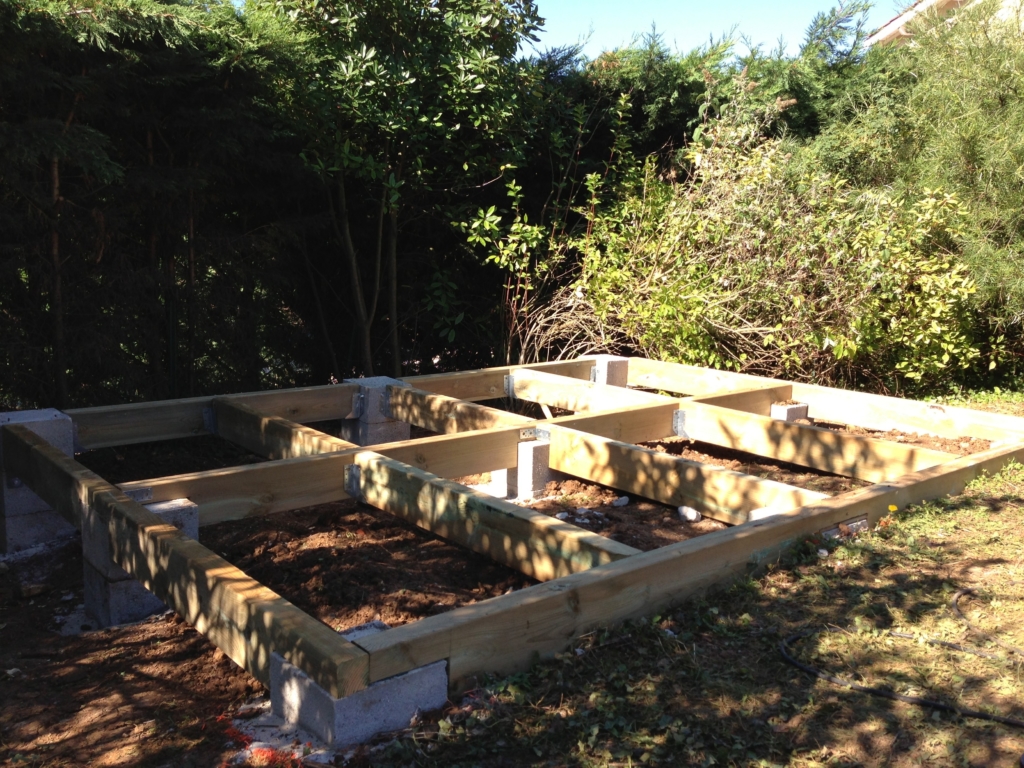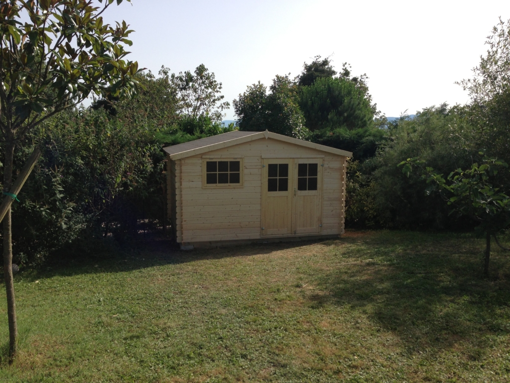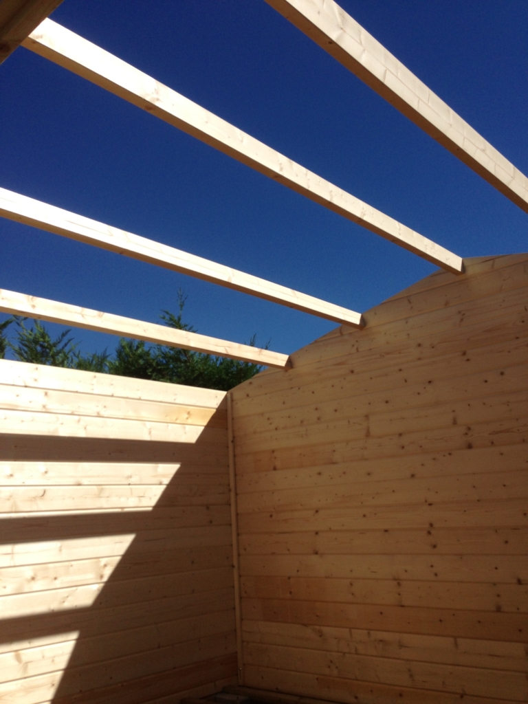 Montage d’un abri de jardin en Sapin Epicéa (provenance Europe du nord), à madriers de 28mm. Il est équipé d’un plancher, d’une porte double vitrée et d’une fenêtre basculante. Pour une stabilité parfaite, la structure de cet abri a été posée et fixée solidement sur des piliers en béton, montés à des hauteurs différentes (terrain pentu). Le toit est habillé d’une couverture en feutre bitumé noir.
