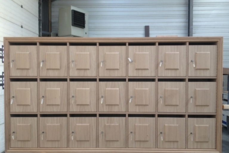 Made in Bois peut réaliser tout type de menuiseries, y compris ce bloc de boîtes aux lettres en bois pour une copropriété.