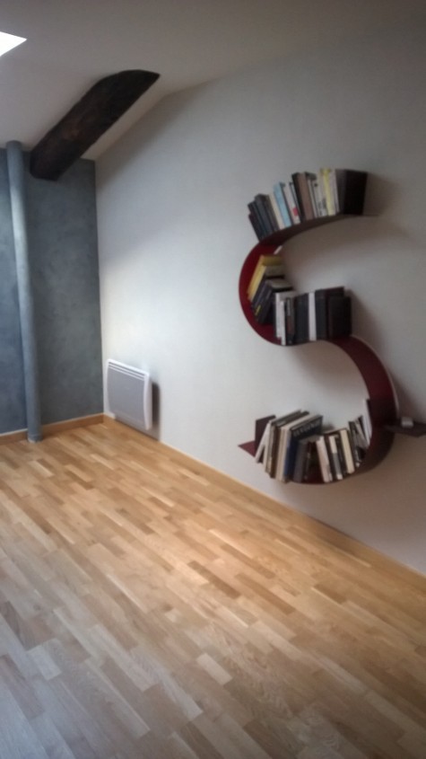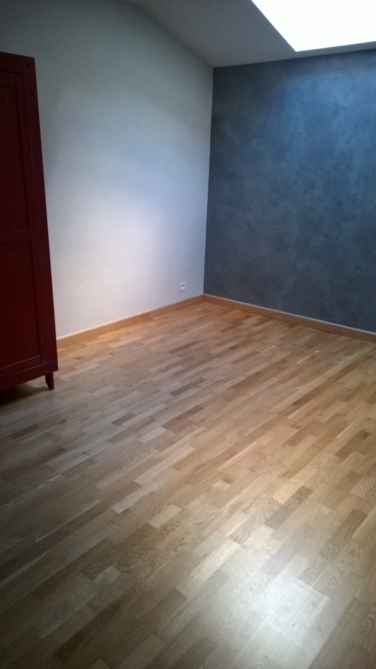 Pose d’un parquet flottant chêne vernis 3 frises, dimensions 11.5 mm d’épaisseur x 180mm de largeur x 2200mm de longueur. Sous le parquet, a été installée une sous couche isolante. En finition, des plinthes assorties au parquet, plaquées chêne vernis ont été posées, ainsi qu’un seuil de porte en chêne massif sur mesure.