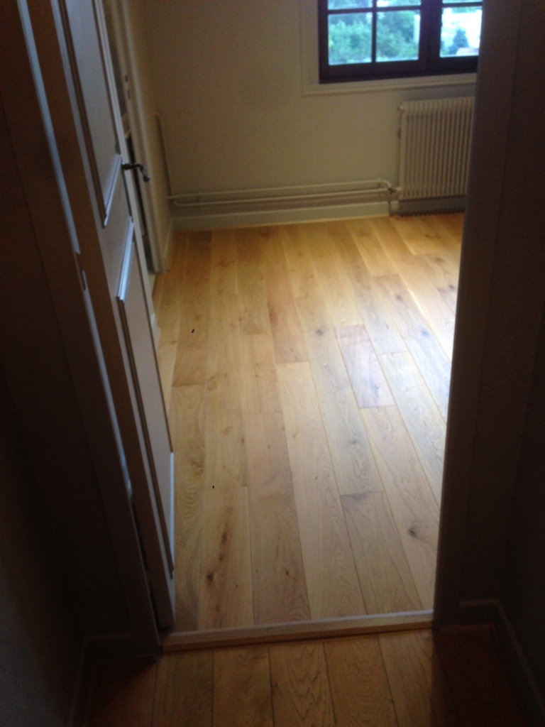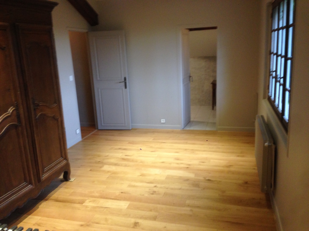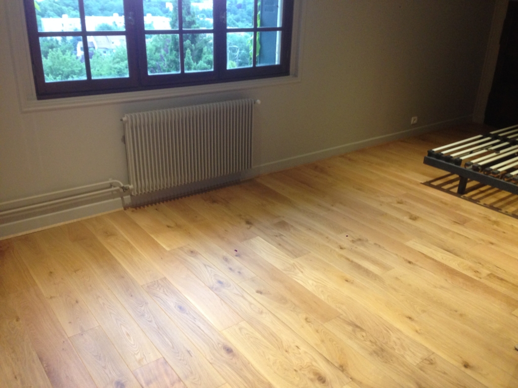 Pose d’un parquet collé chêne massif Rully vernis mat, dimensions 14mm d’épaisseur x 150mm de largeur x 400 à 2300mm de longueur. Fabrication avec 2 chanfreins, pose rainure et languette. Convient aux sols chauffants. En finition, des quarts de rond assortis au parquet ont été posés, ainsi que des seuils de porte en chêne massif sur mesure.