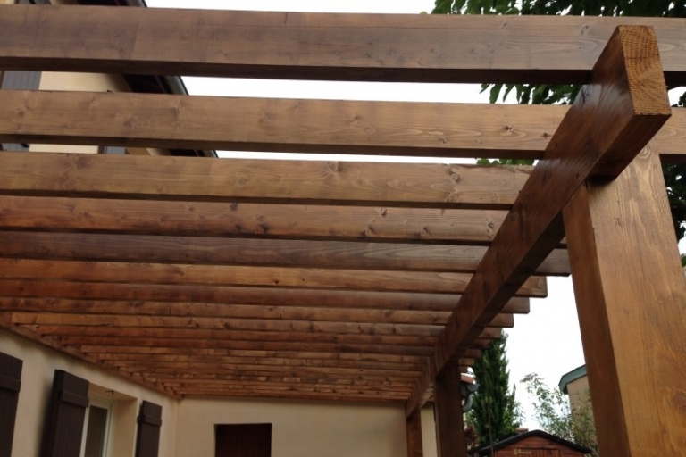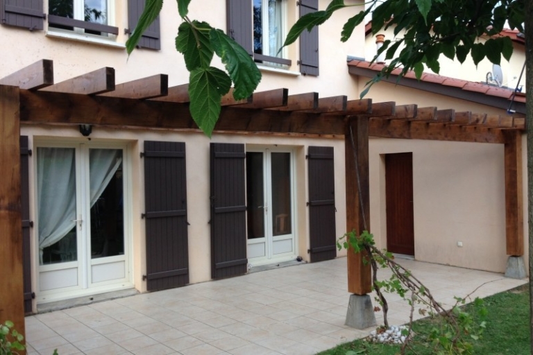 Création d’une pergola en sapin du nord dans la région de Lyon (Pommiers) avec application d’une lasure pour protéger le bois.