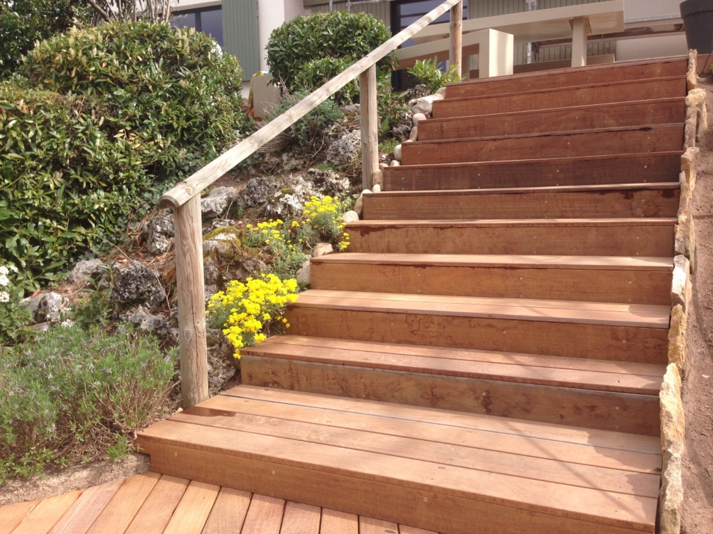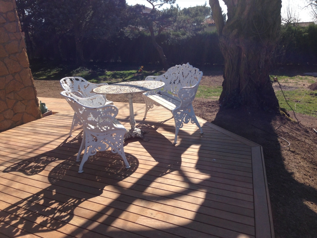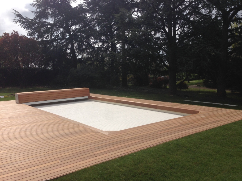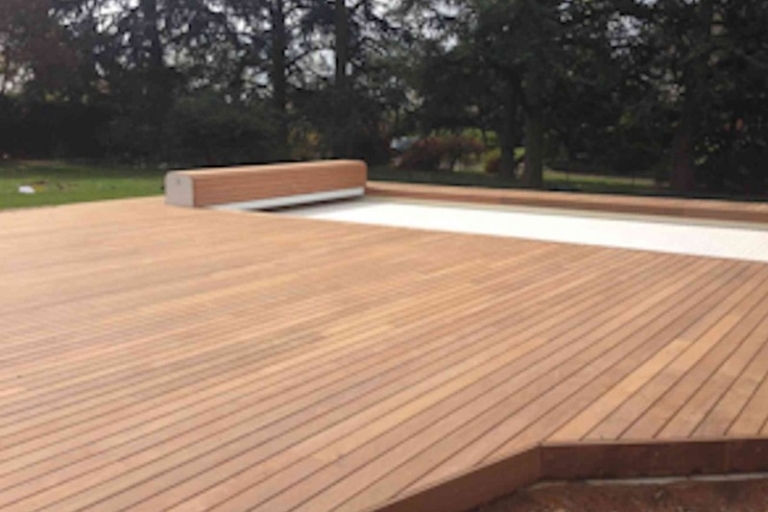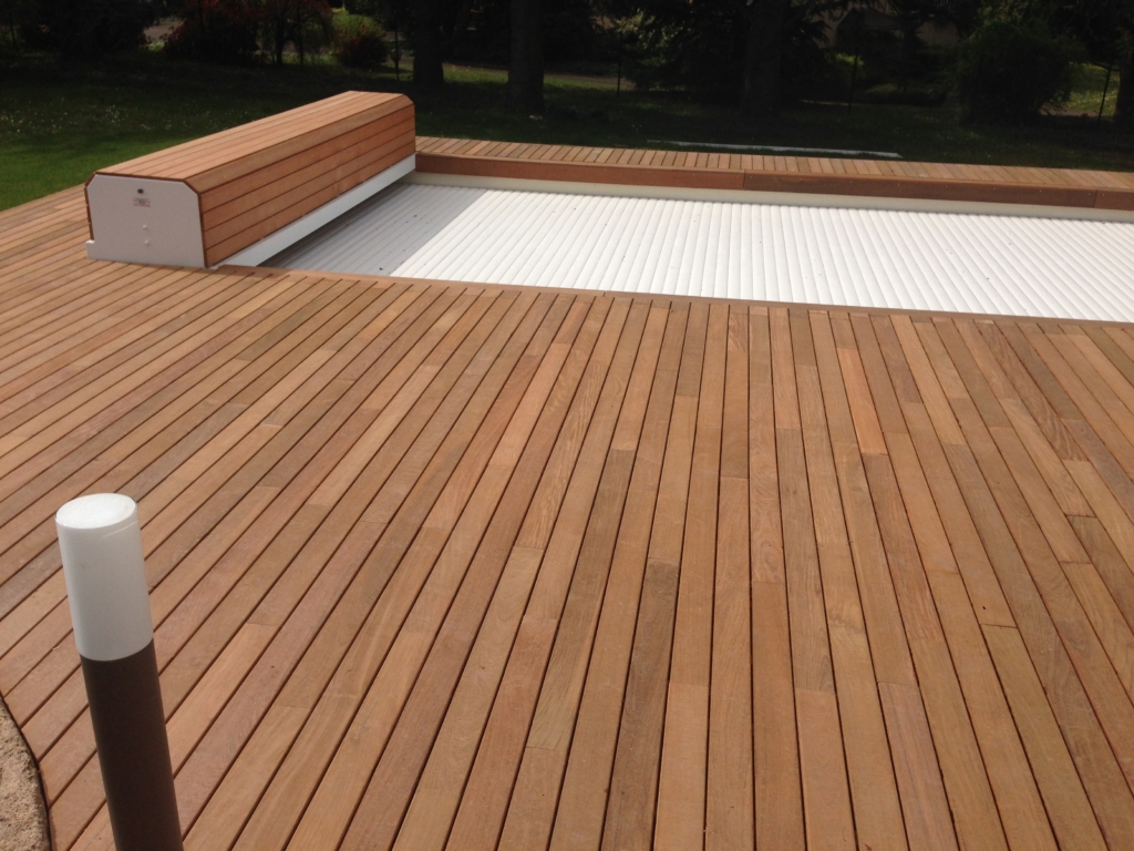 Plage de piscine à Dardilly (Rhône) Réalisation d’une plage de piscine en ipé à Dardilly, avec habillage du volet de protection.