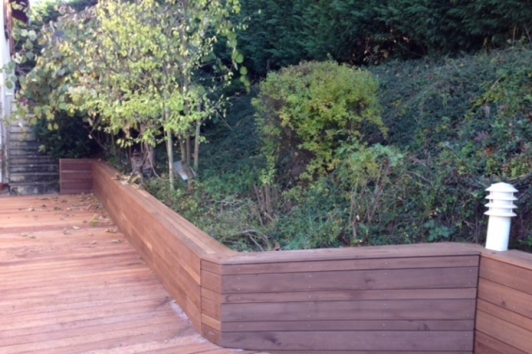 Réalisation d’une plage de piscine en bois exotique, le murure, et habillage du muret en bordure de la terrasse en peuplier thermo chauffé.