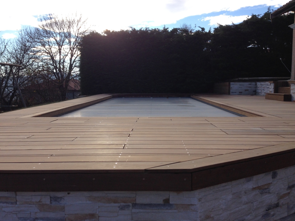 Réalisation d’une plage de piscine en bois exotique (ipé) à Vaugneray dans le Rhône. La particularité de ce projet : plusieurs niveaux à habiller ainsi que des murets en pierre.