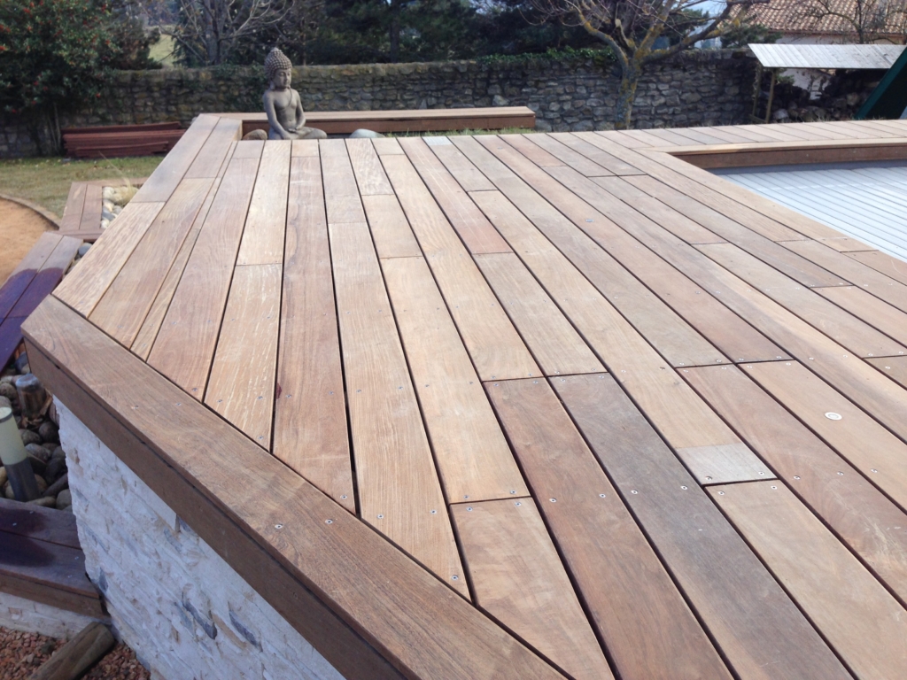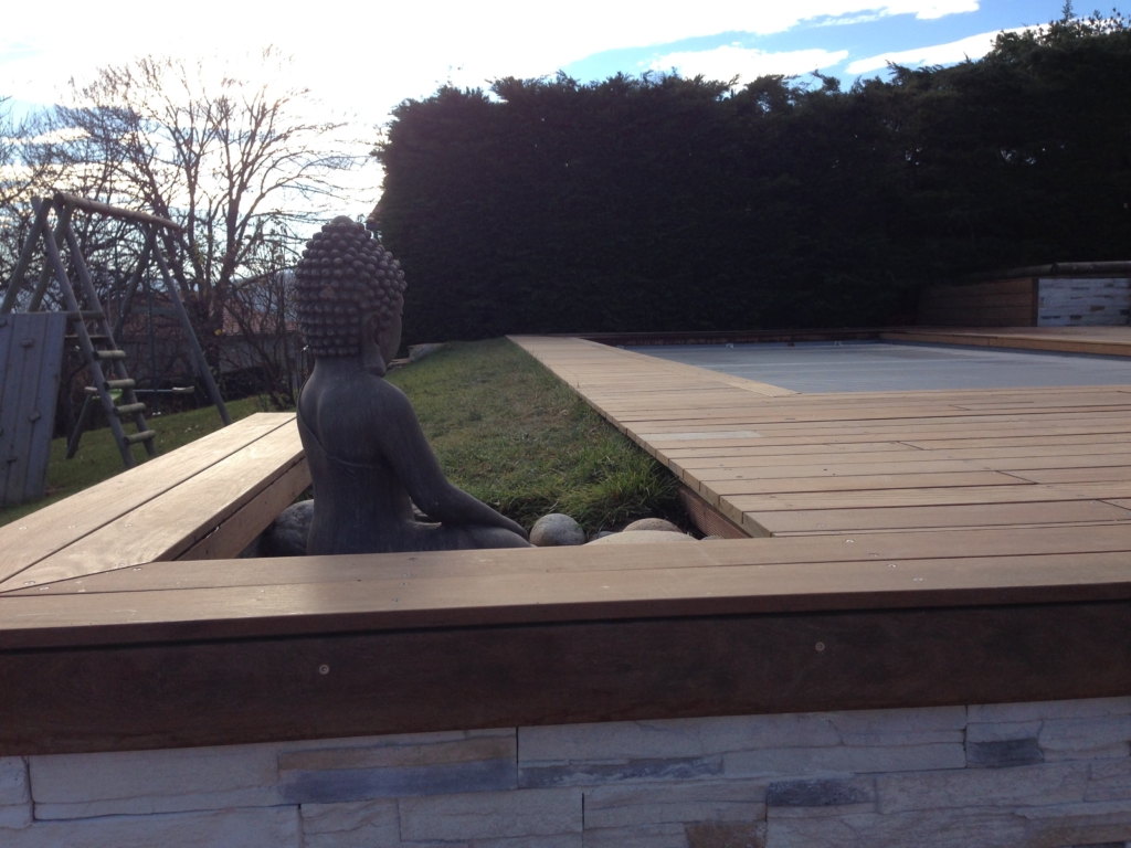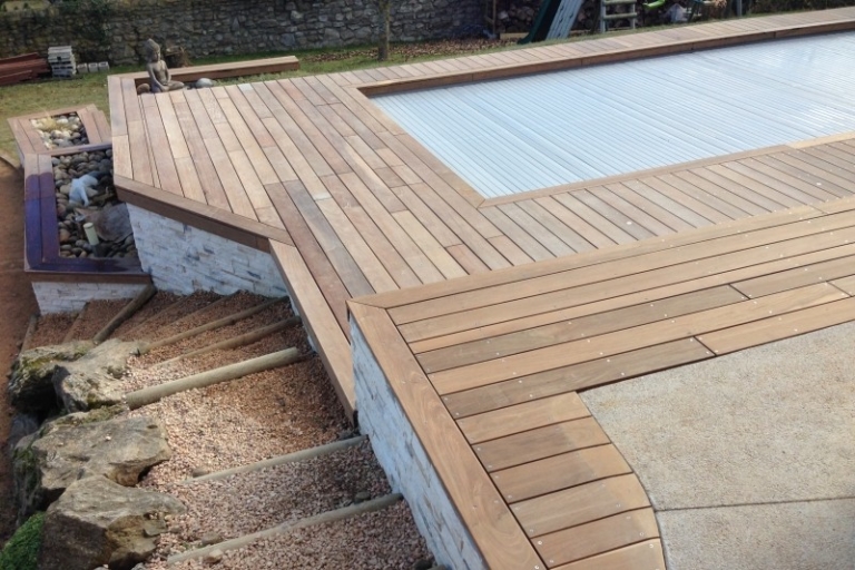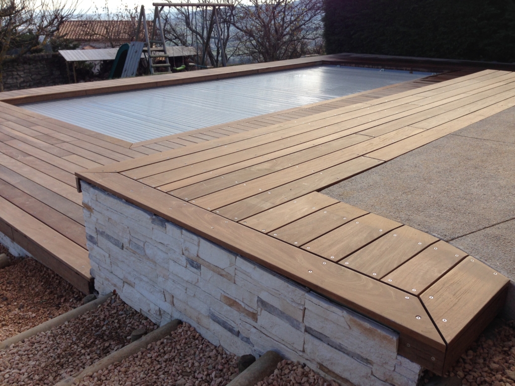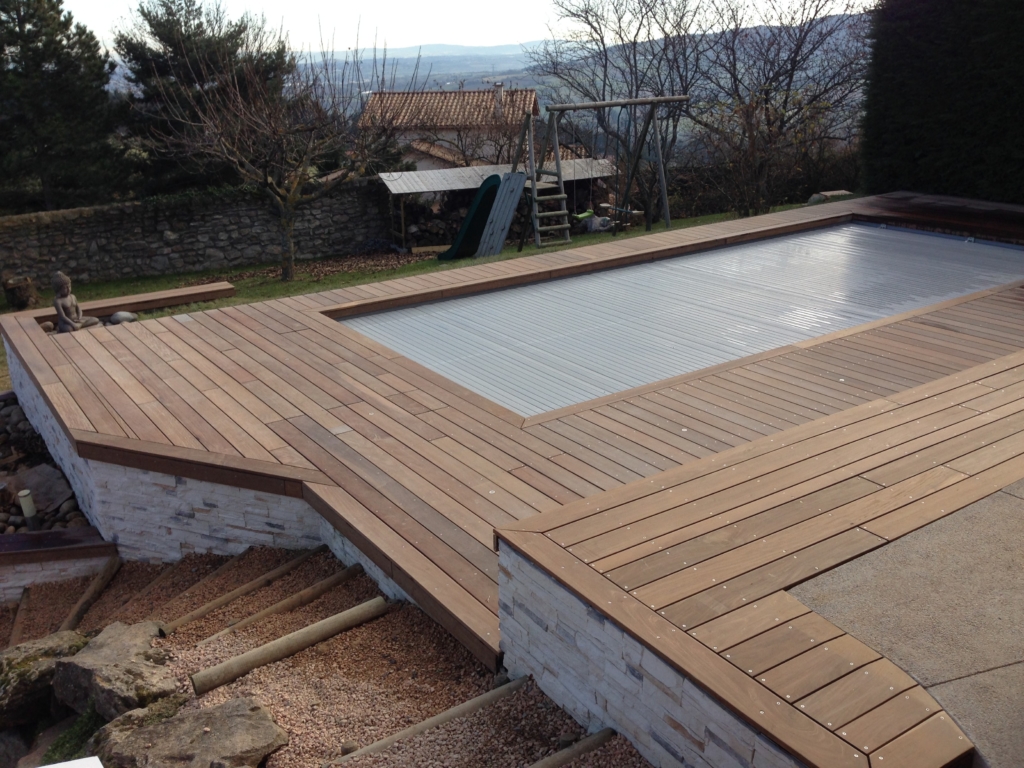 Réalisation d’une plage de piscine en bois exotique (ipé) à Vaugneray dans le Rhône. La particularité de ce projet : plusieurs niveaux à habiller ainsi que des murets en pierre.