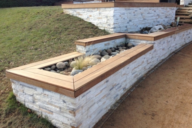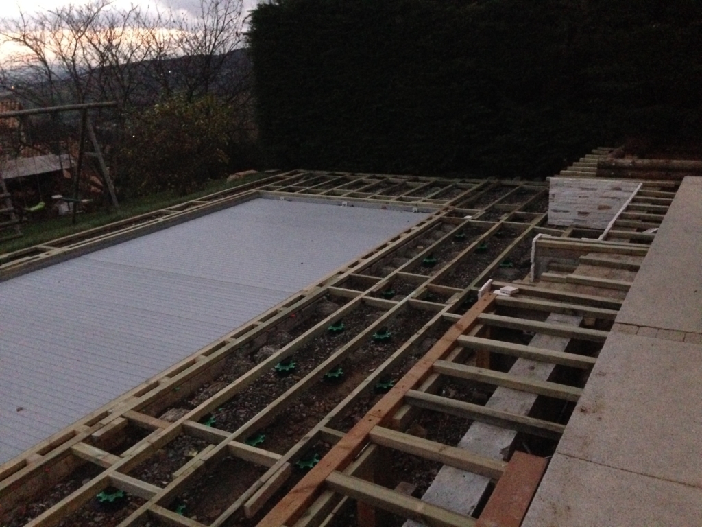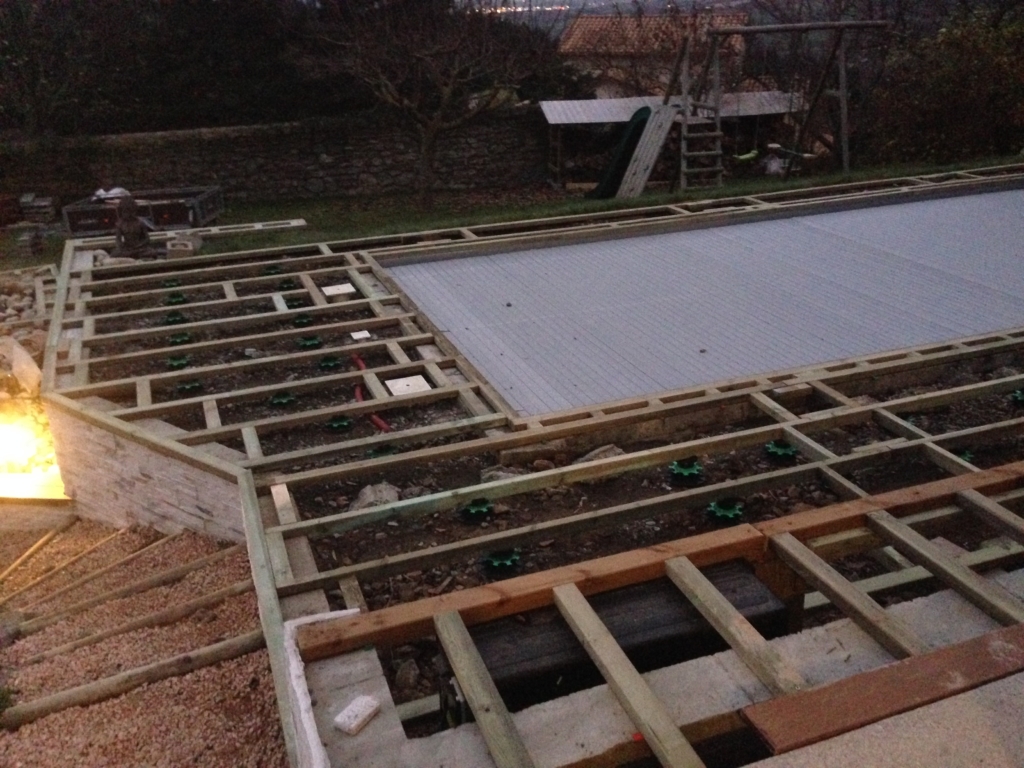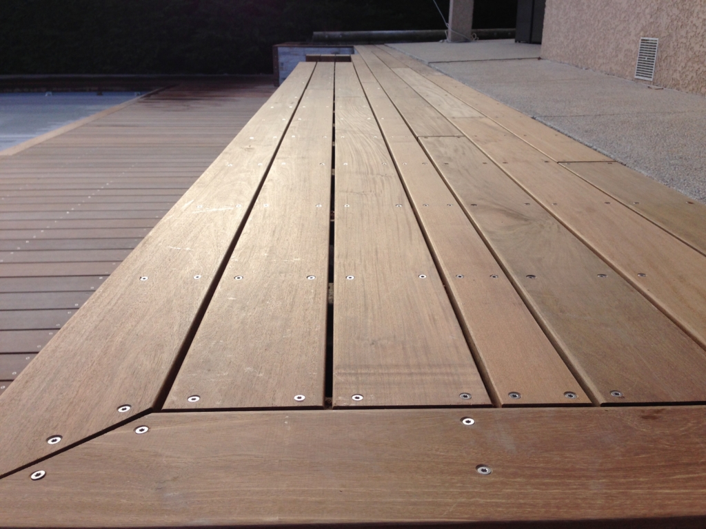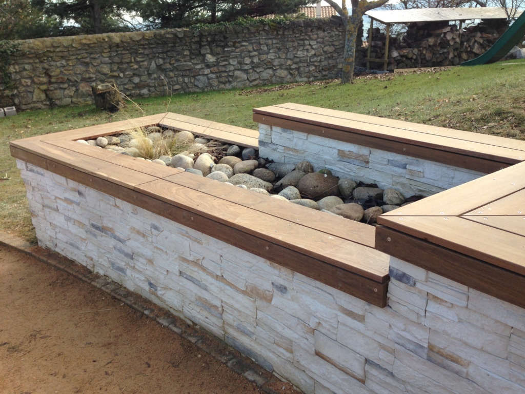 Réalisation d’une plage de piscine en bois exotique (ipé) à Vaugneray dans le Rhône. La particularité de ce projet : plusieurs niveaux à habiller ainsi que des murets en pierre.