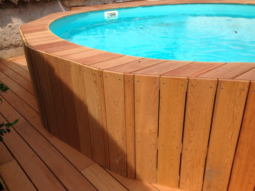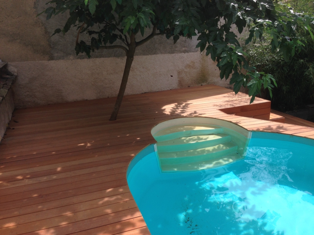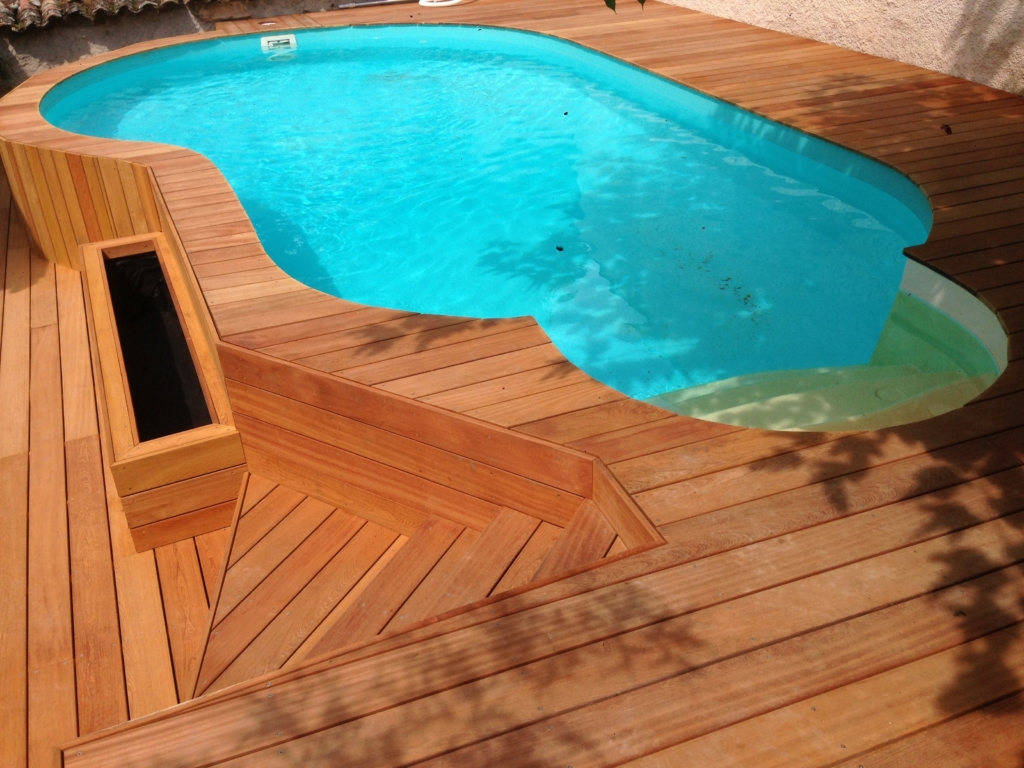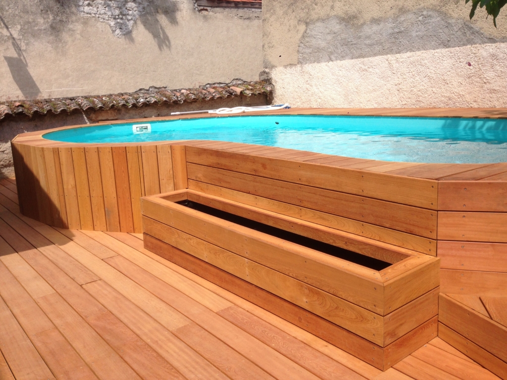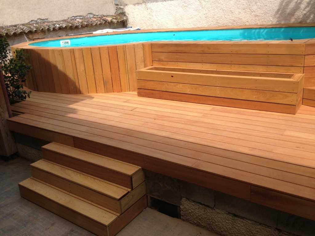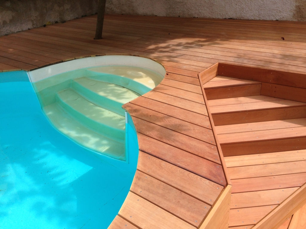 Autour d’une piscine hors sol de forme originale et arrondie, création d’une plage sur 2 niveaux. L’essence choisie pour ce projet est un bois exotique nommé Mururé. Un escalier asymétrique a été conçu afin de donner du caractère à cette réalisation. Pour associer bois et végétaux et apporter ainsi une touche de couleur à l’ensemble, un grand bac à fleurs a été intégré au centre de l’ouvrage.