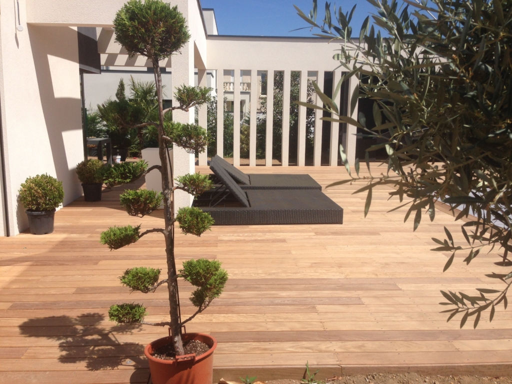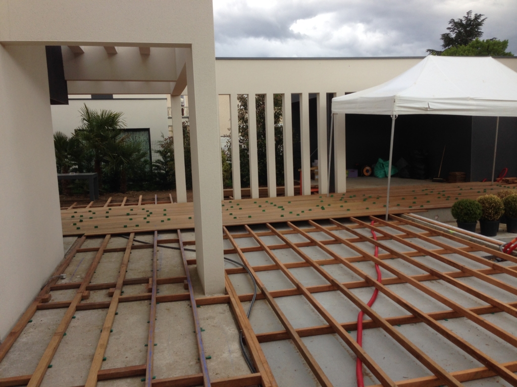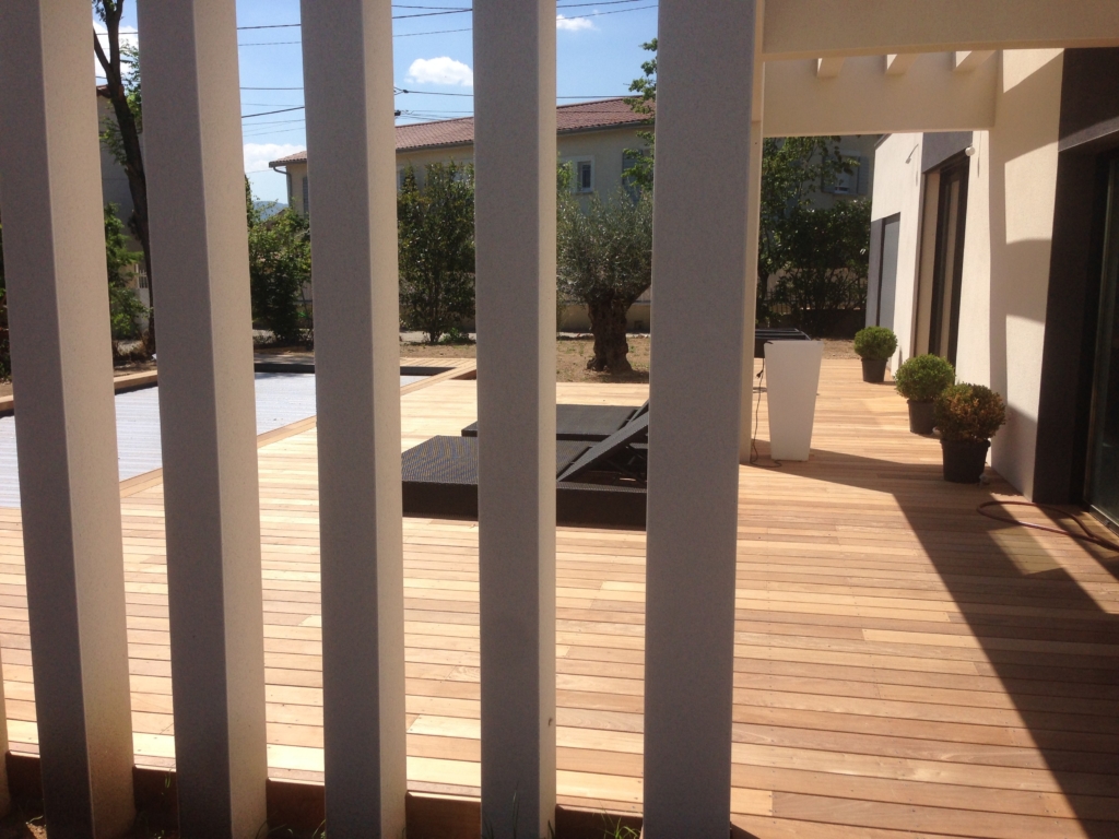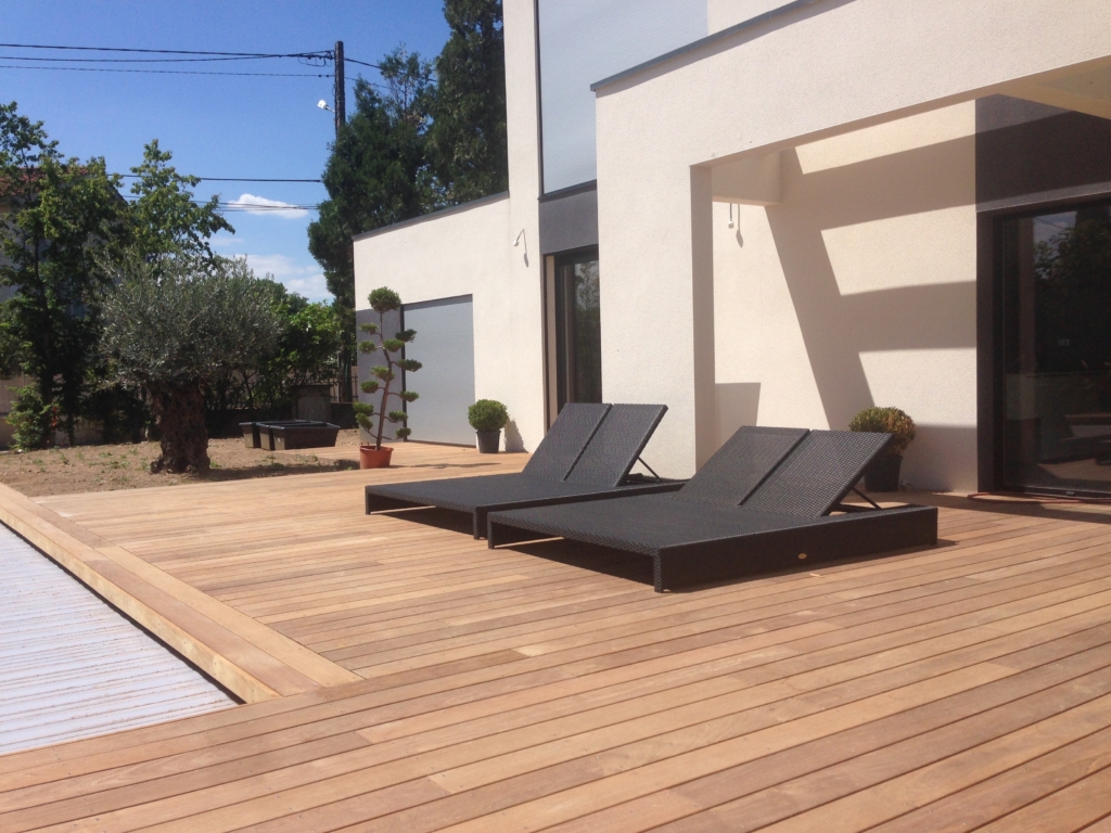 Habillage en bois exotique Ipé de la terrasse et de la plage de piscine d’une belle maison contemporaine située sur la commune de Tassin la Demi Lune. Les margelles de la piscine sont également habillées de bois exotique. Des plinthes de finition ont été posées sur toute la périphérie de la réalisation. Une grande partie de la structure a été créée en double lambourdages (lambourdes exotiques).